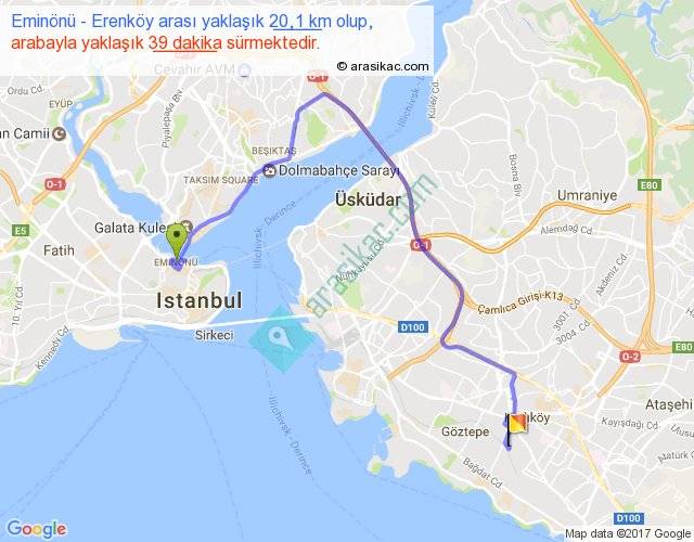 Eminönü - Erenköy arası yaklaşık olarak 90 km/h ile yukarıda belirtilen sürede olup, iki yerin kuş uçuşu uzaklığı (mesafesi) 10'dir. Yolculuk otobüsle 50 dakika sürmektedir.