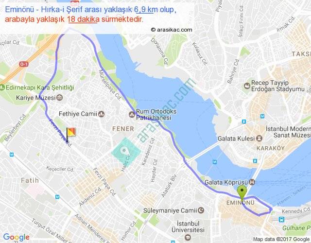 Eminönü - Hırka-i Şerif arası yaklaşık olarak 90 km/h ile yukarıda belirtilen sürede olup, iki yerin kuş uçuşu uzaklığı (mesafesi) 3'dir. Yolculuk otobüsle 23 dakika sürmektedir.