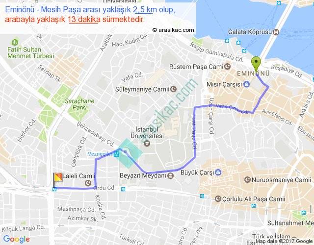 Eminönü - Mesih Paşa arası yaklaşık olarak 90 km/h ile yukarıda belirtilen sürede olup, iki yerin kuş uçuşu uzaklığı (mesafesi) 2'dir. Yolculuk otobüsle 16 dakika sürmektedir.