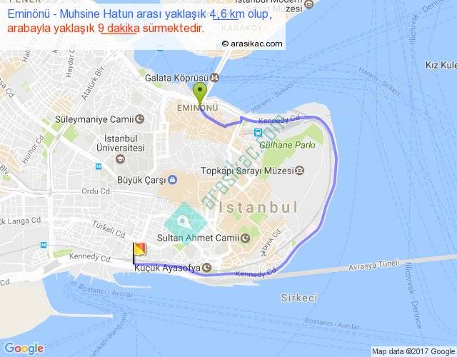 Eminönü - Muhsine Hatun arası yaklaşık olarak 90 km/h ile yukarıda belirtilen sürede olup, iki yerin kuş uçuşu uzaklığı (mesafesi) 2'dir. Yolculuk otobüsle 11 dakika sürmektedir.