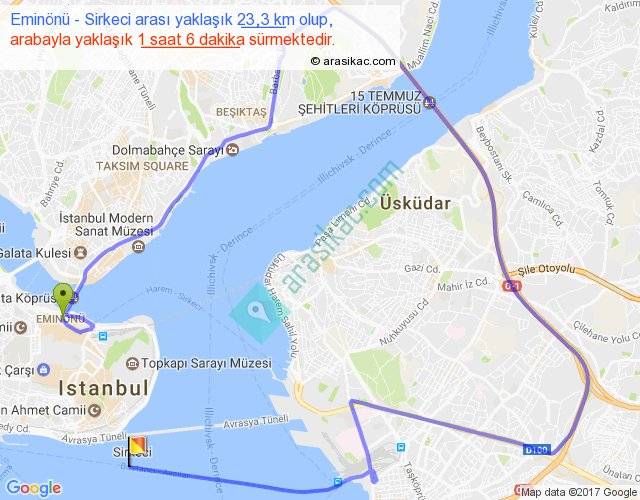 Eminönü - Sirkeci arası yaklaşık olarak 90 km/h ile yukarıda belirtilen sürede olup, iki yerin kuş uçuşu uzaklığı (mesafesi) 2'dir. Yolculuk otobüsle 1 saat 25 dakika sürmektedir.