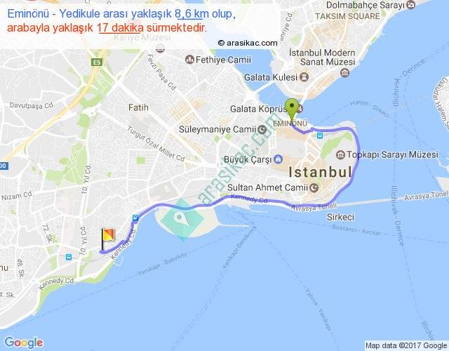 Eminönü - Yedikule arası yaklaşık olarak 90 km/h ile yukarıda belirtilen sürede olup, iki yerin kuş uçuşu uzaklığı (mesafesi) 5'dir. Yolculuk otobüsle 22 dakika sürmektedir.