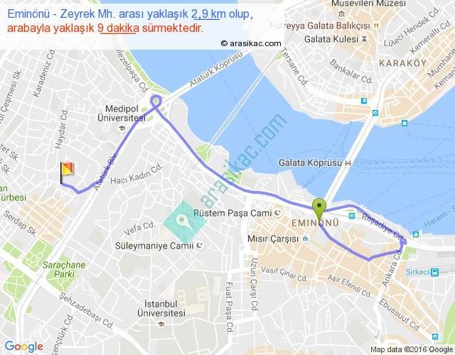 Eminönü - Zeyrek Mh. arası yaklaşık olarak 90 km/h ile yukarıda belirtilen sürede olup, iki yerin kuş uçuşu uzaklığı (mesafesi) 1'dir. Yolculuk otobüsle 11 dakika sürmektedir.