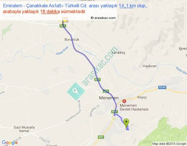 Emiralem - Çanakkale Asfaltı-Türkelli Cd. arası yaklaşık olarak 90 km/h ile yukarıda belirtilen sürede olup, iki yerin kuş uçuşu uzaklığı (mesafesi) 12'dir. Yolculuk otobüsle 23 dakika sürmektedir.