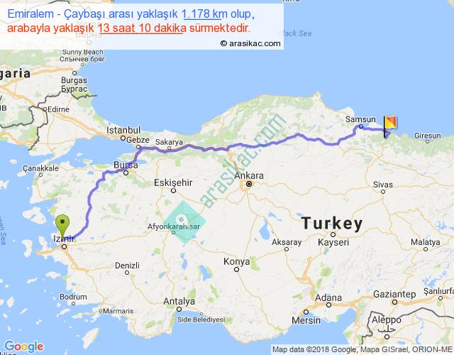 Emiralem - Çaybaşı arası yaklaşık olarak 90 km/h ile yukarıda belirtilen sürede olup, iki yerin kuş uçuşu uzaklığı (mesafesi) 891'dir. Eğer belirtilen yerler arasında uçak seferi var ise bu süre uçakla 1 saat 22 dakika'ya kadar düşebilir. Yolculuk otobüsle 17 saat 7 dakika sürmektedir.