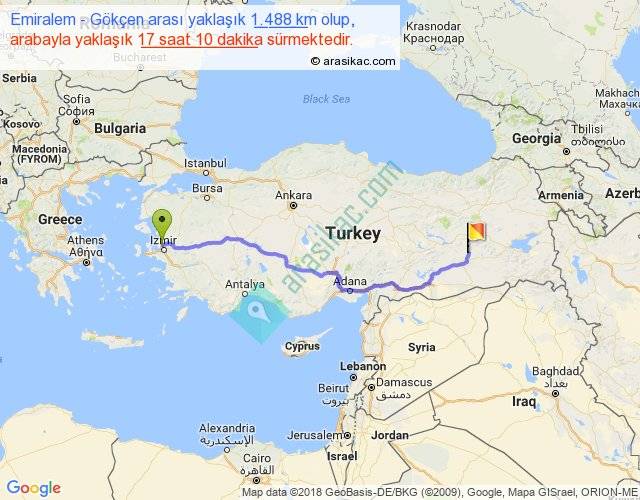 Emiralem - Gökçen arası yaklaşık olarak 90 km/h ile yukarıda belirtilen sürede olup, iki yerin kuş uçuşu uzaklığı (mesafesi) 1164'dir. Eğer belirtilen yerler arasında uçak seferi var ise bu süre uçakla 1 saat 47 dakika'ya kadar düşebilir. Yolculuk otobüsle 22 saat 19 dakika sürmektedir.
