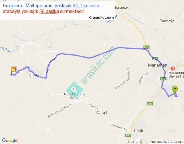 Emiralem - Maltepe arası yaklaşık olarak 90 km/h ile yukarıda belirtilen sürede olup, iki yerin kuş uçuşu uzaklığı (mesafesi) 17'dir. Yolculuk otobüsle 46 dakika sürmektedir.