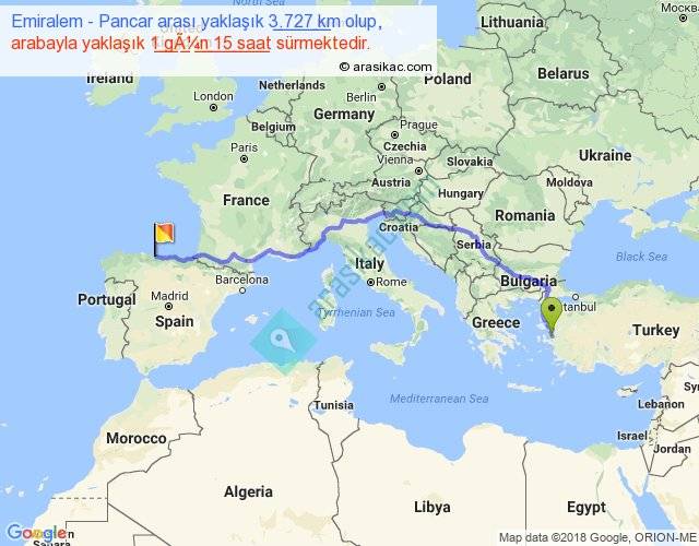 Emiralem - Pancar arası yaklaşık olarak 90 km/h ile yukarıda belirtilen sürede olup, iki yerin kuş uçuşu uzaklığı (mesafesi) 2694'dir. Eğer belirtilen yerler arasında uçak seferi var ise bu süre uçakla 4 saat 08 dakika'ya kadar düşebilir. Yolculuk otobüsle 2 gün 2 saat sürmektedir.