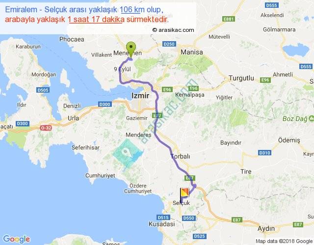 Emiralem - Selçuk arası yaklaşık olarak 90 km/h ile yukarıda belirtilen sürede olup, iki yerin kuş uçuşu uzaklığı (mesafesi) 74'dir. Yolculuk otobüsle 1 saat 40 dakika sürmektedir.