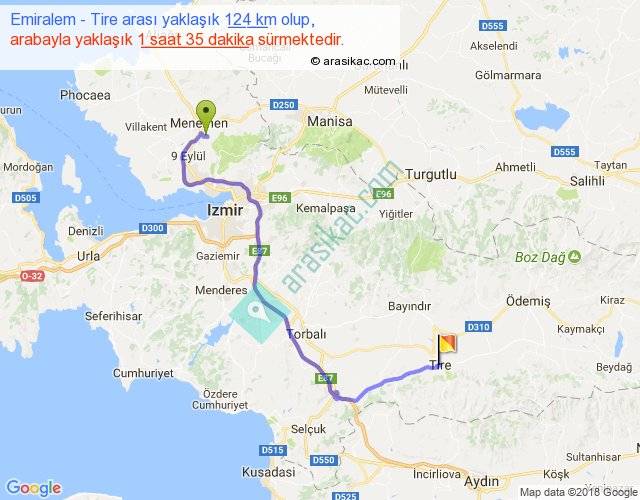 Emiralem - Tire arası yaklaşık olarak 90 km/h ile yukarıda belirtilen sürede olup, iki yerin kuş uçuşu uzaklığı (mesafesi) 78'dir. Yolculuk otobüsle 2 saat 3 dakika sürmektedir.