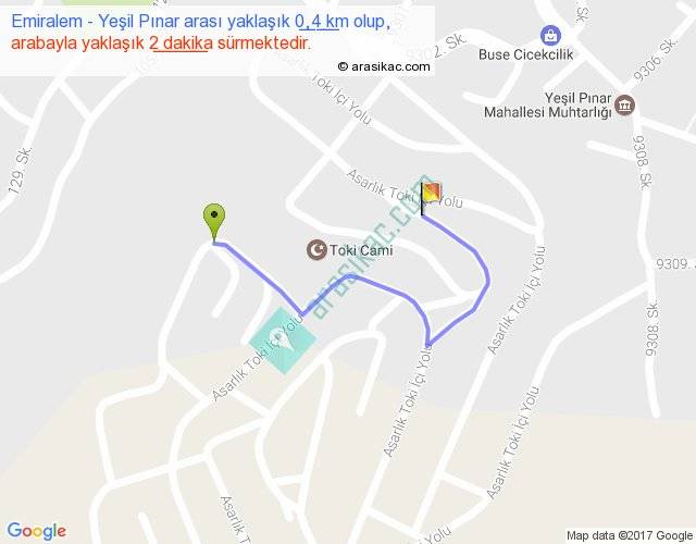 Emiralem - Yeşil Pınar arası yaklaşık olarak 90 km/h ile yukarıda belirtilen sürede olup, iki yerin kuş uçuşu uzaklığı (mesafesi) 0'dir. Yolculuk otobüsle 2 dakika sürmektedir.