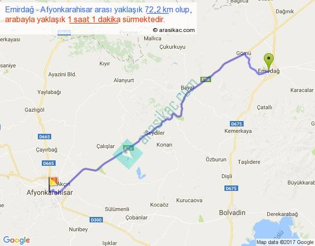 Emirdağ - Afyonkarahisar arası yaklaşık olarak 90 km/h ile yukarıda belirtilen sürede olup, iki yerin kuş uçuşu uzaklığı (mesafesi) 60'dir. Yolculuk otobüsle 1 saat 18 dakika sürmektedir.