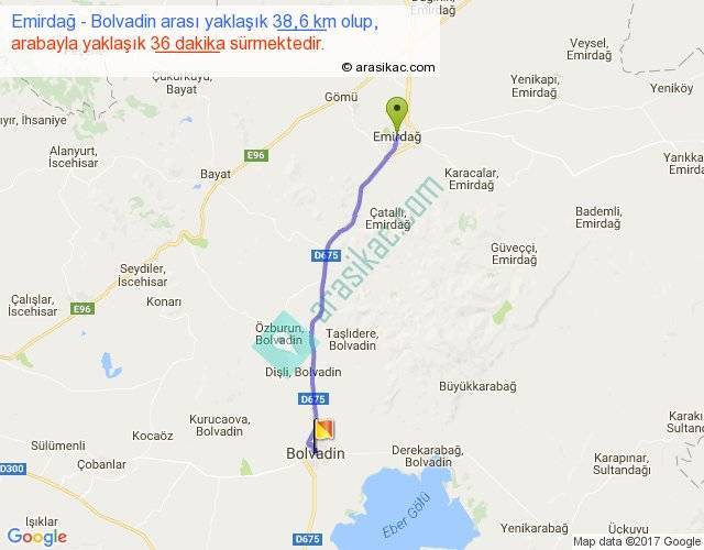 Emirdağ - Bolvadin arası yaklaşık olarak 90 km/h ile yukarıda belirtilen sürede olup, iki yerin kuş uçuşu uzaklığı (mesafesi) 35'dir. Yolculuk otobüsle 46 dakika sürmektedir.