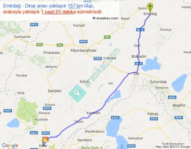 Emirdağ - Dinar arası yaklaşık olarak 90 km/h ile yukarıda belirtilen sürede olup, iki yerin kuş uçuşu uzaklığı (mesafesi) 135'dir. Yolculuk otobüsle 2 saat 29 dakika sürmektedir.