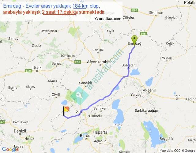 Emirdağ - Evciler arası yaklaşık olarak 90 km/h ile yukarıda belirtilen sürede olup, iki yerin kuş uçuşu uzaklığı (mesafesi) 154'dir. Yolculuk otobüsle 2 saat 58 dakika sürmektedir.