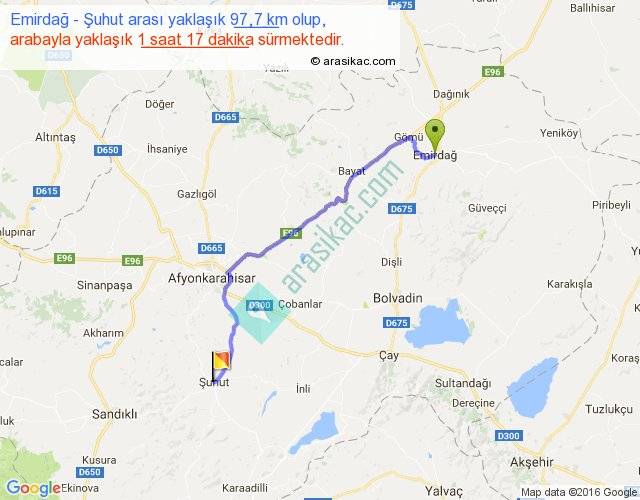 Emirdağ - Şuhut arası yaklaşık olarak 90 km/h ile yukarıda belirtilen sürede olup, iki yerin kuş uçuşu uzaklığı (mesafesi) 75'dir. Yolculuk otobüsle 1 saat 40 dakika sürmektedir.