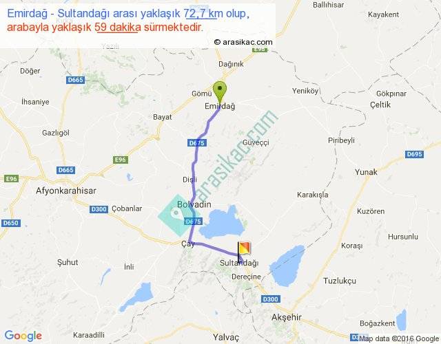 Emirdağ - Sultandağı arası yaklaşık olarak 90 km/h ile yukarıda belirtilen sürede olup, iki yerin kuş uçuşu uzaklığı (mesafesi) 54'dir. Yolculuk otobüsle 1 saat 16 dakika sürmektedir.