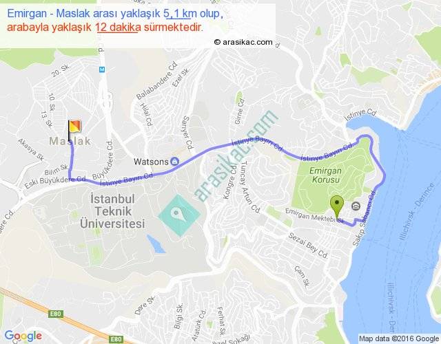 Emirgan - Maslak arası yaklaşık olarak 90 km/h ile yukarıda belirtilen sürede olup, iki yerin kuş uçuşu uzaklığı (mesafesi) 3'dir. Yolculuk otobüsle 15 dakika sürmektedir.