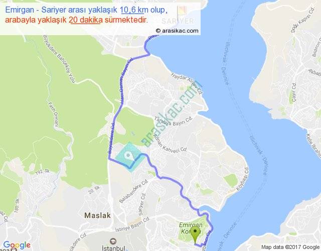 Emirgan - Sariyer arası yaklaşık olarak 90 km/h ile yukarıda belirtilen sürede olup, iki yerin kuş uçuşu uzaklığı (mesafesi) 6'dir. Yolculuk otobüsle 26 dakika sürmektedir.