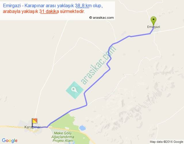 Emirgazi - Karapınar arası yaklaşık olarak 90 km/h ile yukarıda belirtilen sürede olup, iki yerin kuş uçuşu uzaklığı (mesafesi) 33'dir. Yolculuk otobüsle 40 dakika sürmektedir.