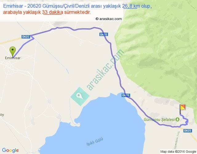 Emirhisar - 20620 Gümüşsu Çivril Denizli arası yaklaşık olarak 90 km/h ile yukarıda belirtilen sürede olup, iki yerin kuş uçuşu uzaklığı (mesafesi) 17'dir. Yolculuk otobüsle 42 dakika sürmektedir.