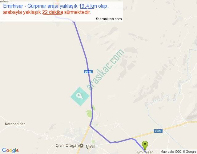 Emirhisar - Gürpınar arası yaklaşık olarak 90 km/h ile yukarıda belirtilen sürede olup, iki yerin kuş uçuşu uzaklığı (mesafesi) 16'dir. Yolculuk otobüsle 28 dakika sürmektedir.