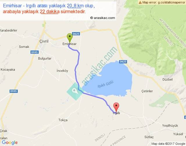 Emirhisar - Irgıllı arası yaklaşık olarak 90 km/h ile yukarıda belirtilen sürede olup, iki yerin kuş uçuşu uzaklığı (mesafesi) 17'dir. Yolculuk otobüsle 28 dakika sürmektedir.