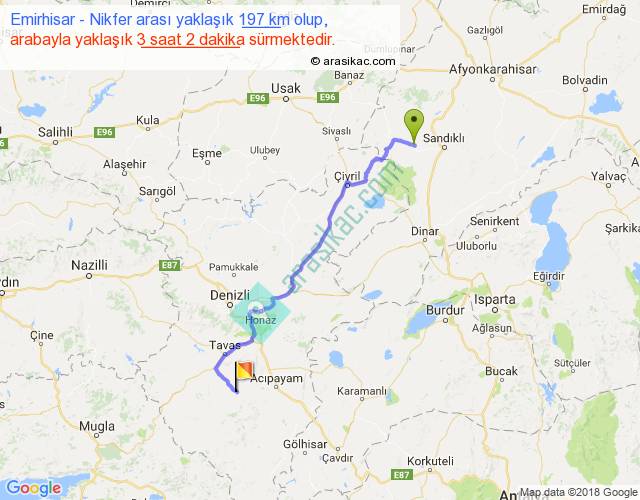 Emirhisar - Nikfer arası yaklaşık olarak 90 km/h ile yukarıda belirtilen sürede olup, iki yerin kuş uçuşu uzaklığı (mesafesi) 146'dir. Yolculuk otobüsle 3 saat 56 dakika sürmektedir.