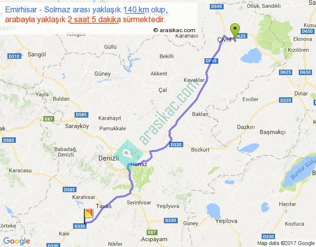 Emirhisar - Solmaz arası yaklaşık olarak 90 km/h ile yukarıda belirtilen sürede olup, iki yerin kuş uçuşu uzaklığı (mesafesi) 115'dir. Yolculuk otobüsle 2 saat 42 dakika sürmektedir.