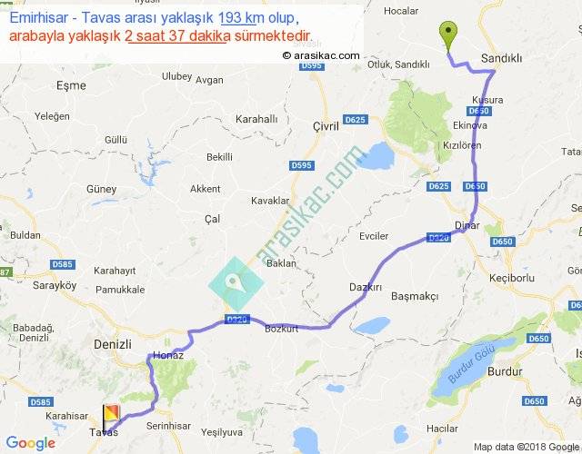 Emirhisar - Tavas arası yaklaşık olarak 90 km/h ile yukarıda belirtilen sürede olup, iki yerin kuş uçuşu uzaklığı (mesafesi) 135'dir. Yolculuk otobüsle 3 saat 24 dakika sürmektedir.