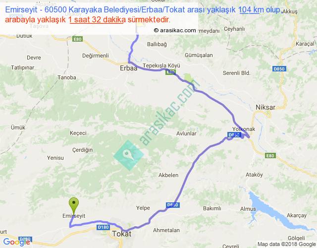Emirseyit - 60500 Karayaka Belediyesi Erbaa Tokat arası yaklaşık olarak 90 km/h ile yukarıda belirtilen sürede olup, iki yerin kuş uçuşu uzaklığı (mesafesi) 45'dir. Yolculuk otobüsle 1 saat 59 dakika sürmektedir.