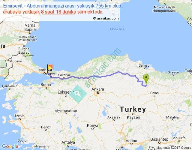 Emirseyit - Abdurrahmangazi arası yaklaşık olarak 90 km/h ile yukarıda belirtilen sürede olup, iki yerin kuş uçuşu uzaklığı (mesafesi) 607'dir. Eğer belirtilen yerler arasında uçak seferi var ise bu süre uçakla 56 dakika'ya kadar düşebilir. Yolculuk otobüsle 10 saat 47 dakika sürmektedir.