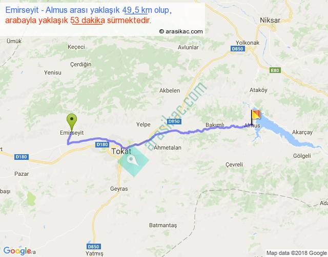 Emirseyit - Almus arası yaklaşık olarak 90 km/h ile yukarıda belirtilen sürede olup, iki yerin kuş uçuşu uzaklığı (mesafesi) 41'dir. Yolculuk otobüsle 1 saat 8 dakika sürmektedir.
