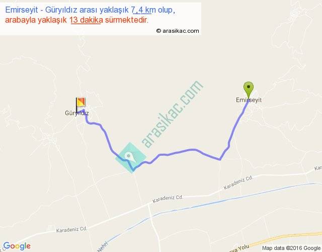 Emirseyit - Güryıldız arası yaklaşık olarak 90 km/h ile yukarıda belirtilen sürede olup, iki yerin kuş uçuşu uzaklığı (mesafesi) 5'dir. Yolculuk otobüsle 16 dakika sürmektedir.