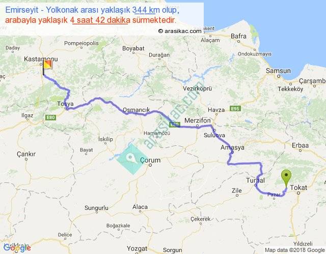 Emirseyit - Yolkonak arası yaklaşık olarak 90 km/h ile yukarıda belirtilen sürede olup, iki yerin kuş uçuşu uzaklığı (mesafesi) 241'dir. Yolculuk otobüsle 6 saat 6 dakika sürmektedir.