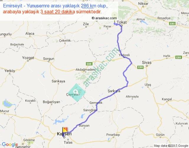 Emirseyit - Yunusemre arası yaklaşık olarak 90 km/h ile yukarıda belirtilen sürede olup, iki yerin kuş uçuşu uzaklığı (mesafesi) 197'dir. Yolculuk otobüsle 4 saat 20 dakika sürmektedir.