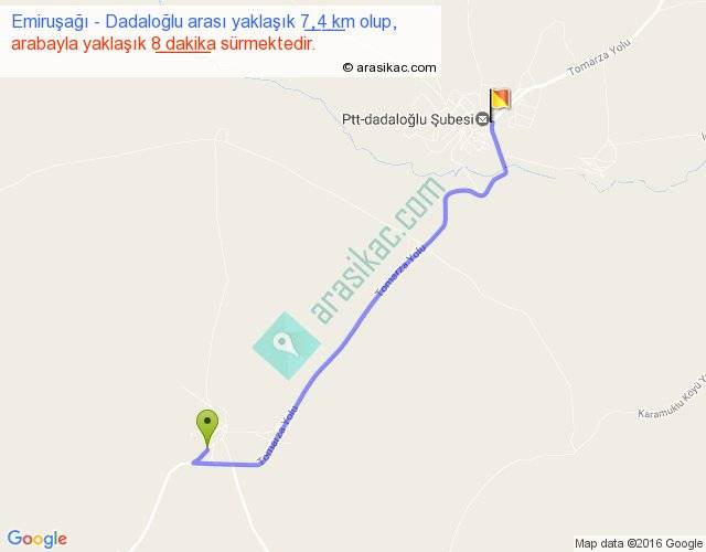Emiruşağı - Dadaloğlu arası yaklaşık olarak 90 km/h ile yukarıda belirtilen sürede olup, iki yerin kuş uçuşu uzaklığı (mesafesi) 6'dir. Yolculuk otobüsle 10 dakika sürmektedir.