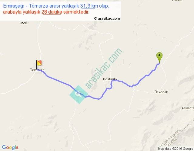 Emiruşağı - Tomarza arası yaklaşık olarak 90 km/h ile yukarıda belirtilen sürede olup, iki yerin kuş uçuşu uzaklığı (mesafesi) 24'dir. Yolculuk otobüsle 36 dakika sürmektedir.