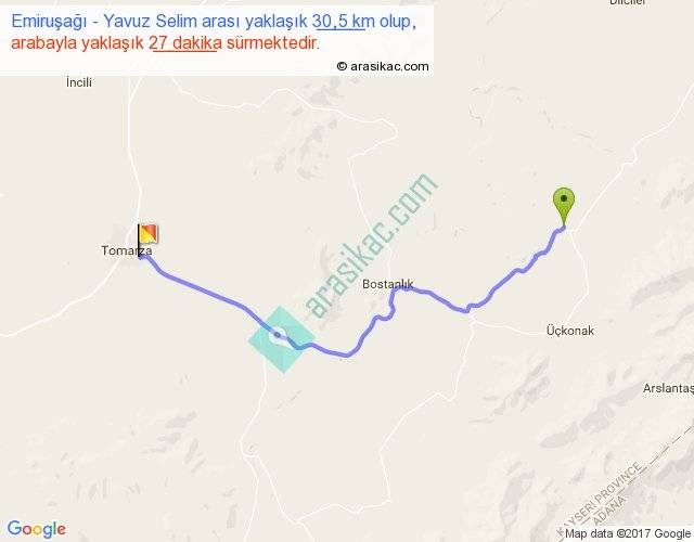 Emiruşağı - Yavuz Selim arası yaklaşık olarak 90 km/h ile yukarıda belirtilen sürede olup, iki yerin kuş uçuşu uzaklığı (mesafesi) 23'dir. Yolculuk otobüsle 35 dakika sürmektedir.