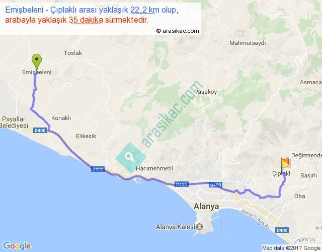 Emişbeleni - Çıplaklı arası yaklaşık olarak 90 km/h ile yukarıda belirtilen sürede olup, iki yerin kuş uçuşu uzaklığı (mesafesi) 16'dir. Yolculuk otobüsle 45 dakika sürmektedir.
