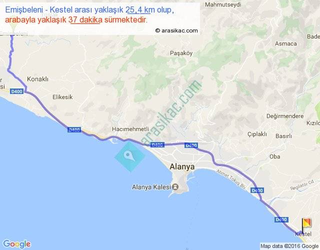Emişbeleni - Kestel arası yaklaşık olarak 90 km/h ile yukarıda belirtilen sürede olup, iki yerin kuş uçuşu uzaklığı (mesafesi) 21'dir. Yolculuk otobüsle 48 dakika sürmektedir.