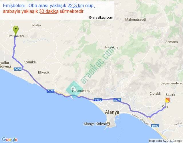 Emişbeleni - Oba arası yaklaşık olarak 90 km/h ile yukarıda belirtilen sürede olup, iki yerin kuş uçuşu uzaklığı (mesafesi) 18'dir. Yolculuk otobüsle 42 dakika sürmektedir.
