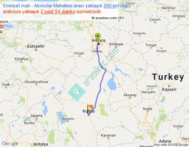 Emniyet mah - Akıncılar Mahallesi arası yaklaşık olarak 90 km/h ile yukarıda belirtilen sürede olup, iki yerin kuş uçuşu uzaklığı (mesafesi) 228'dir. Yolculuk otobüsle 3 saat 46 dakika sürmektedir.