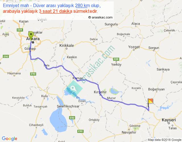 Emniyet mah - Düver arası yaklaşık olarak 90 km/h ile yukarıda belirtilen sürede olup, iki yerin kuş uçuşu uzaklığı (mesafesi) 222'dir. Yolculuk otobüsle 4 saat 21 dakika sürmektedir.
