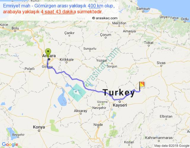 Emniyet mah - Gömürgen arası yaklaşık olarak 90 km/h ile yukarıda belirtilen sürede olup, iki yerin kuş uçuşu uzaklığı (mesafesi) 306'dir. Eğer belirtilen yerler arasında uçak seferi var ise bu süre uçakla 28 dakika'ya kadar düşebilir. Yolculuk otobüsle 6 saat 7 dakika sürmektedir.