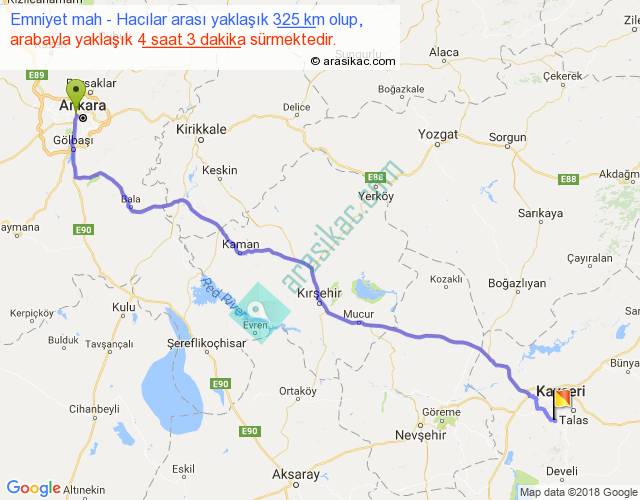 Emniyet mah - Hacılar arası yaklaşık olarak 90 km/h ile yukarıda belirtilen sürede olup, iki yerin kuş uçuşu uzaklığı (mesafesi) 267'dir. Eğer belirtilen yerler arasında uçak seferi var ise bu süre uçakla 24 dakika'ya kadar düşebilir. Yolculuk otobüsle 5 saat 15 dakika sürmektedir.