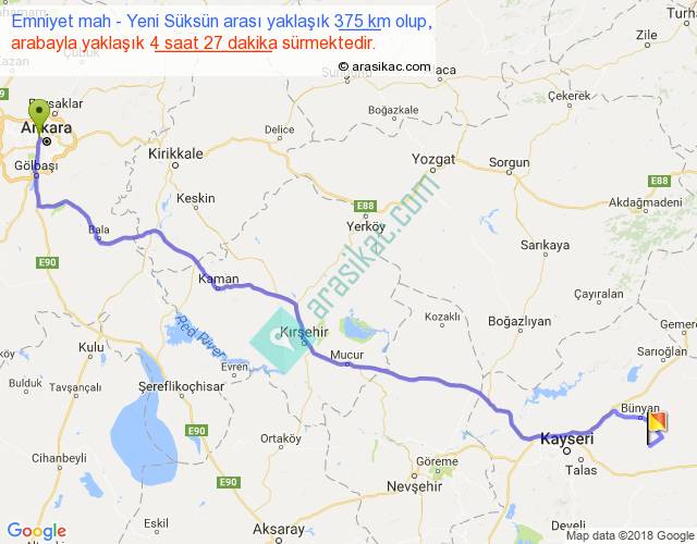 Emniyet mah - Yeni Süksün arası yaklaşık olarak 90 km/h ile yukarıda belirtilen sürede olup, iki yerin kuş uçuşu uzaklığı (mesafesi) 295'dir. Eğer belirtilen yerler arasında uçak seferi var ise bu süre uçakla 27 dakika'ya kadar düşebilir. Yolculuk otobüsle 5 saat 47 dakika sürmektedir.