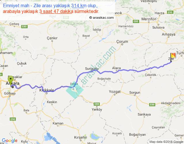 Emniyet mah - Zile arası yaklaşık olarak 90 km/h ile yukarıda belirtilen sürede olup, iki yerin kuş uçuşu uzaklığı (mesafesi) 262'dir. Eğer belirtilen yerler arasında uçak seferi var ise bu süre uçakla 24 dakika'ya kadar düşebilir. Yolculuk otobüsle 4 saat 55 dakika sürmektedir.