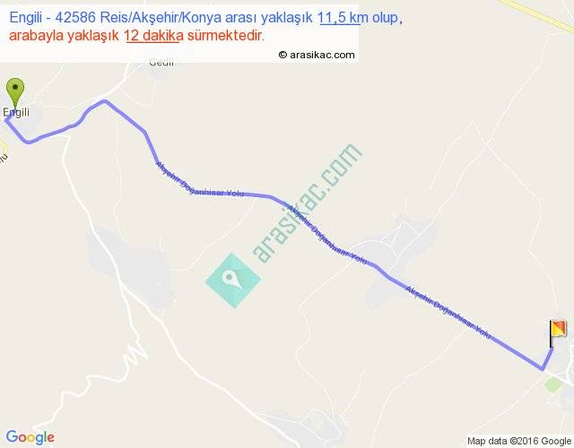 Engili - 42586 Reis Akşehir Konya arası yaklaşık olarak 90 km/h ile yukarıda belirtilen sürede olup, iki yerin kuş uçuşu uzaklığı (mesafesi) 10'dir. Yolculuk otobüsle 15 dakika sürmektedir.
