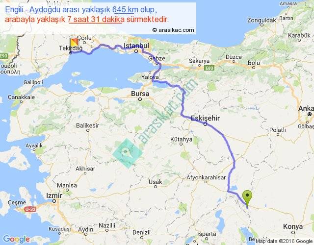 Engili - Aydoğdu arası yaklaşık olarak 90 km/h ile yukarıda belirtilen sürede olup, iki yerin kuş uçuşu uzaklığı (mesafesi) 448'dir. Eğer belirtilen yerler arasında uçak seferi var ise bu süre uçakla 41 dakika'ya kadar düşebilir. Yolculuk otobüsle 9 saat 46 dakika sürmektedir.